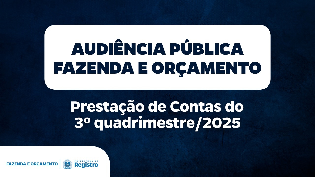 A Prefeitura de Registro, por meio da Secretaria Municipal da Fazenda e Orçamento, convida a população para participar da Audiência Pública sobre as Metas Fiscais referentes ao 3º quadrimestre de 2025, que será realizada no dia 27 de fevereiro, às 16h30, no Plenário da Câmara Municipal, localizado na Rua Shitiro Maeji, nº 459 – Centro.