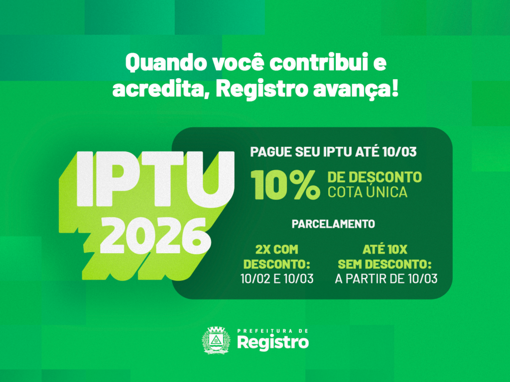 A segunda via do IPTU 2026 já está disponível na página oficial da Prefeitura, no endereço www.registro.sp.gov.br, o que garante acesso antecipado às informações e às modalidades de pagamento.