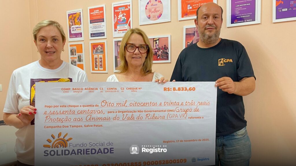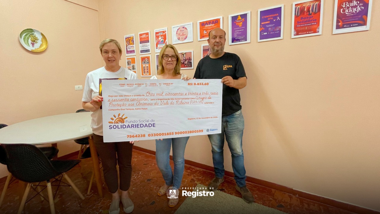 O Fundo Social de Solidariedade de Registro, formalizou, nesta segunda-feira, 17 de novembro, o repasse de R$ 8.833,60 ao Grupo de Proteção aos Animais – Vale do Ribeira (GPAVR). O valor é resultado da venda de aproximadamente 2 mil toneladas de tampinhas plásticas e 400 quilos de lacres de alumínio, arrecadados durante sete meses da campanha “Doe Tampas, Salve Patas”.