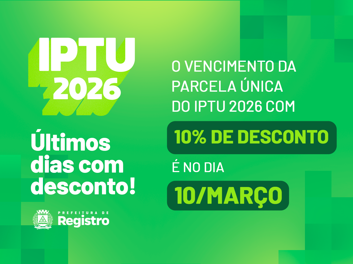 A Prefeitura de Registro, por meio da Secretaria Municipal de Fazenda e Orçamento, informa que a parcela única do IPTU 2026, com 10% de desconto, vence no dia 10 de março.